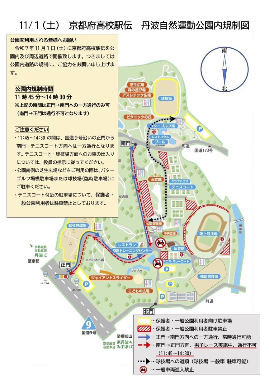 令和7年11 月1日(土)に京都府高校駅伝を公園内及び周辺道路で開催致します。つきましては公園内道路の規制に、ご協力をお願い申し上げます。